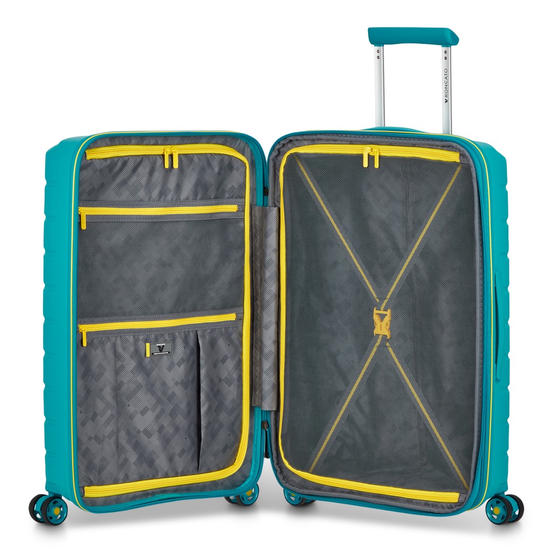 Hledáte kvalitní cestovní kufr, který něco vydrží? Tyrkysový kufr B-flying M od Roncato s vámi zvládne každou dovolenou. Jeho skořepina je vyrobena z odolného polypropylenu, což je pružný, houževnatý materiál, který odolá i hrubému zacházení na letištích.