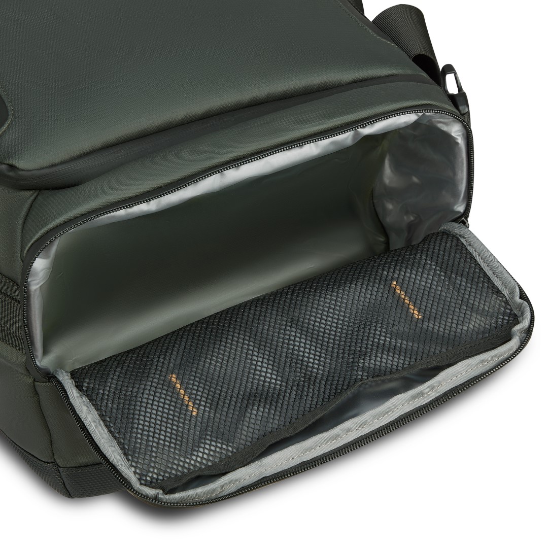 Taška je vyrobená z voděodolného látkového materiálu s ochrannou povrchovou úpravou, který chrání obsah před vlhkostí a nečistotami. Na horní straně je umístěná nenápadná kapsa, ve které jsou uložené ramenní popruhy. Jakmile je vyjmete a připnete do připravených přezek, lze tašku během chvíle přeměnit na batoh. Při běžném používání jsou popruhy bezpečně skryté a nepřekáží.